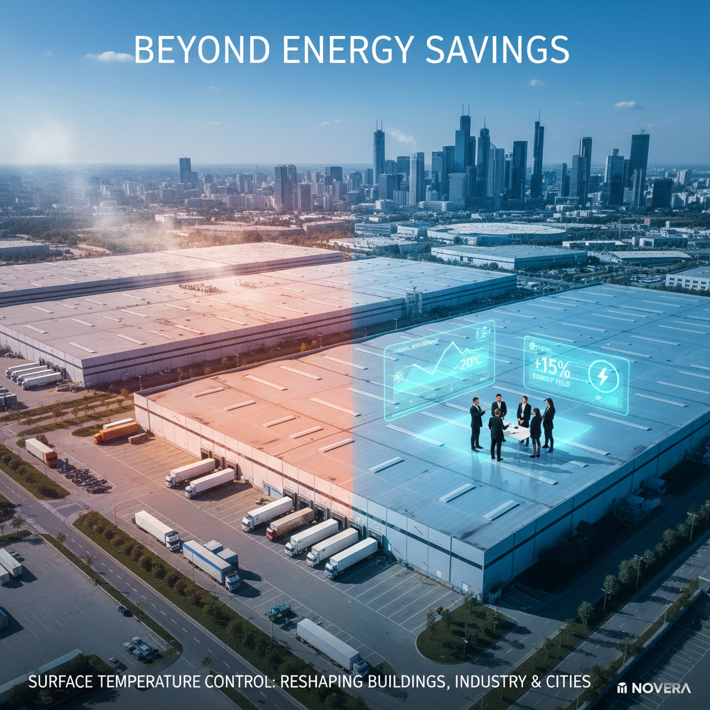 Commercial buildings typically feature large roof areas and experience high operational thermal loads. In these environments, NOVERA delivers fast, measurable returns through reduced cooling demand and improved thermal stability. It stabilises temperatures in technical rooms, server rooms and energy zones, while protecting façades and roofs against UV exposure, material degradation and extreme thermal fluctuations. For facility management, it represents a reliable tool for long-term operational stability.